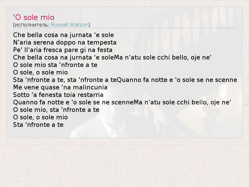 Che bella cosa na jurnata 'e sole N'aria serena doppo na tempesta Pe' ll'aria fresca pare gi na festa Che bella cosa na jurnata 'e soleMa n'atu sole cchi bello, oje ne' O sole mio sta 'nfronte a te O sole, o sole mio Sta 'nfronte a te, sta 'nfronte a teQuanno fa notte e 'o sole se ne scenne Me vene quase 'na malincunia Sotto 'a fenesta toia restarria Quanno fa notte e 'o sole se ne scenneMa n'atu sole cchi bello, oje ne' O sole mio, sta 'nfronte a te O sole, o sole mio Sta 'nfronte a te