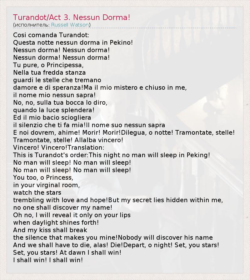 А как ты думаешь, о чем песня "Turandot/Act 3. Nessun Dorma!" ?