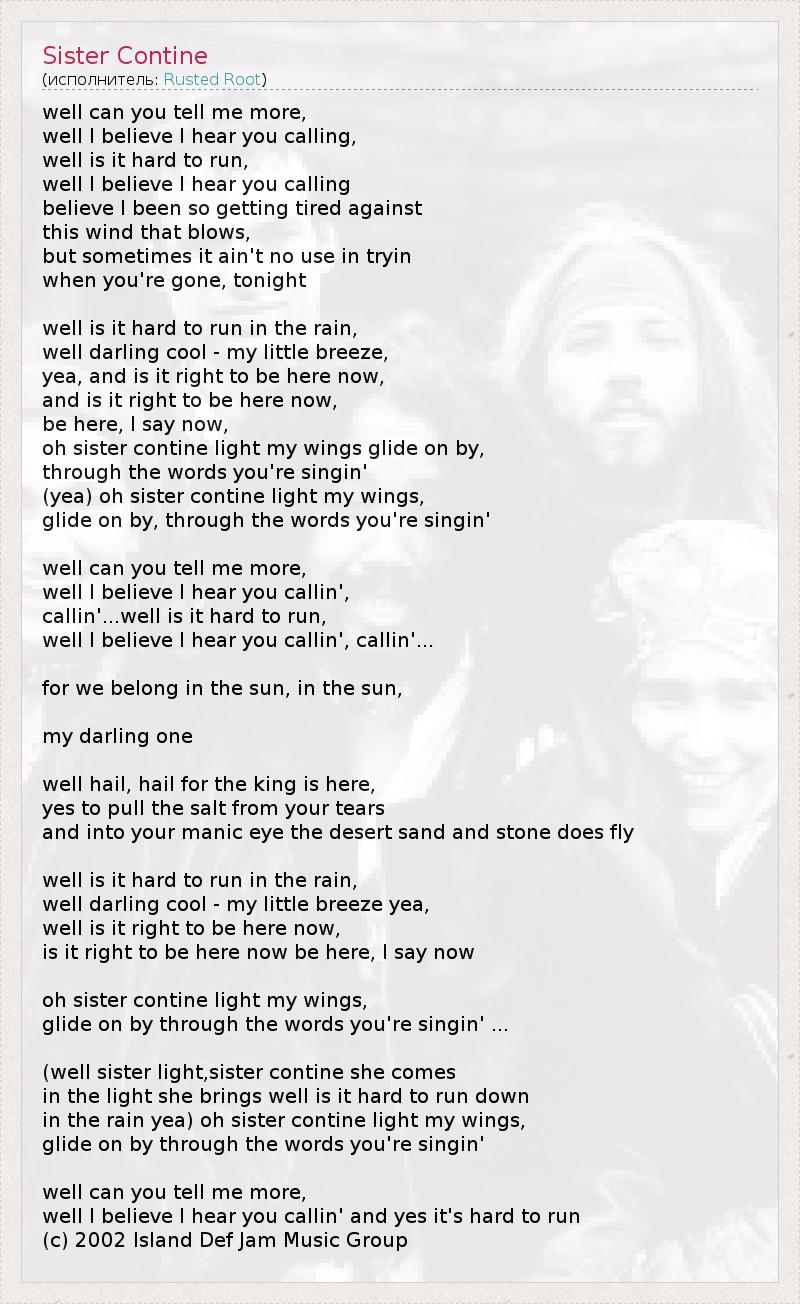 well can you tell me more, well I believe I hear you calling, well is it hard to run, well I believe I hear you calling believe I been so getting tired against this wind that blows, but sometimes it ain't no use in tryin when you're gone, tonight well is it hard to run in the rain, well darling cool - my little breeze, yea, and is it right to be here now, and is it right to be here now, be here, I say now, oh sister contine light my wings glide on by, through the words you're singin' (yea) oh sister contine light my wings, glide on by, through the words you're singin' well can you tell me more, well I believe I hear you callin', callin'...well is it hard to run, well I believe I hear you callin', callin'... for we belong in the sun, in the sun, my darling one well hail, hail for the king is here, yes to pull the salt from your tears and into your manic eye the desert sand and stone does fly well is it hard to run in the rain, well darling cool - my little breeze yea, well is it right to be here now, is it right to be here now be here, I say now oh sister contine light my wings, glide on by through the words you're singin' ... (well sister light,sister contine she comes in the light she brings well is it hard to run down in the rain yea) oh sister contine light my wings, glide on by through the words you're singin' well can you tell me more, well I believe I hear you callin' and yes it's hard to run (c) 2002 Island Def Jam Music Group