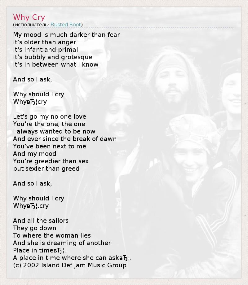 My mood is much darker than fear It's older than anger It's infant and primal It's bubbly and grotesque It's in between what I know And so I ask, Why should I cry Why…cry Let's go my no one love You're the one, the one I always wanted to be now And ever since the break of dawn You've been next to me And my mood You're greedier than sex but sexier than greed And so I ask, Why should I cry Why….cry And all the sailors They go down To where the woman lies And she is dreaming of another Place in time…. A place in time where she can ask…. (c) 2002 Island Def Jam Music Group