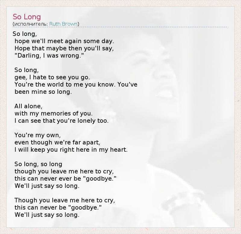 Это интересно:Рут Браун- Американская ритмэндблюзовая певица.30 января 1928, Портсмут, Верджиния - 17 ноября 2006, Лос-Вегас, Невада.Свою карьеру певицы Рут начала в церковном хоре, руководителем которого был ее отец. В середине 40-х начала профессиональную карьеру солисткой оркестра Лаки Миллиндера (Lucky Millinder). В 1948г. подписала контракт с новой тогда фирмой Атлантик (Anlantic). Второй ее сингл "So Long"... продолжение