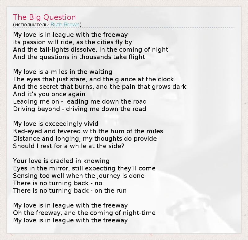 Моя любовь – сродни скоростной трассе: Её страсть неудержима, лишь мелькают города за окном, Да затухают задние фары, исчезая в ночи, Да вопросы тысячами обращаются в бегство. Моя любовь ждёт за многие мили отсюда. Взгляд застыл, приковавшись к часам, И секреты горят, и боль становится чернее, И это снова ты, Вводящая меня в искушение, ведущая меня по дороге, Выводящая меня из терпения, мчащая меня по дороге. Моя любовь вся горит, С воспалённым взором и в лихорадке от грохота миль. На расстоянии и в томлении, моя голова усиленно работает. Не сделать ли мне небольшую остановку на обочине? Твоя любовь покоится в колыбели знания, Глаза в зеркале продолжают ждать, что они придут, Когда поездка окончена, тебе становится так хорошо. Нет пути назад, нет. Нет пути назад, всё время в движении. Моя любовь – сродни скоростной трассе, О, скоростной трассе и надвигающейся ночи. Моя любовь – сродни скоростной трассе...