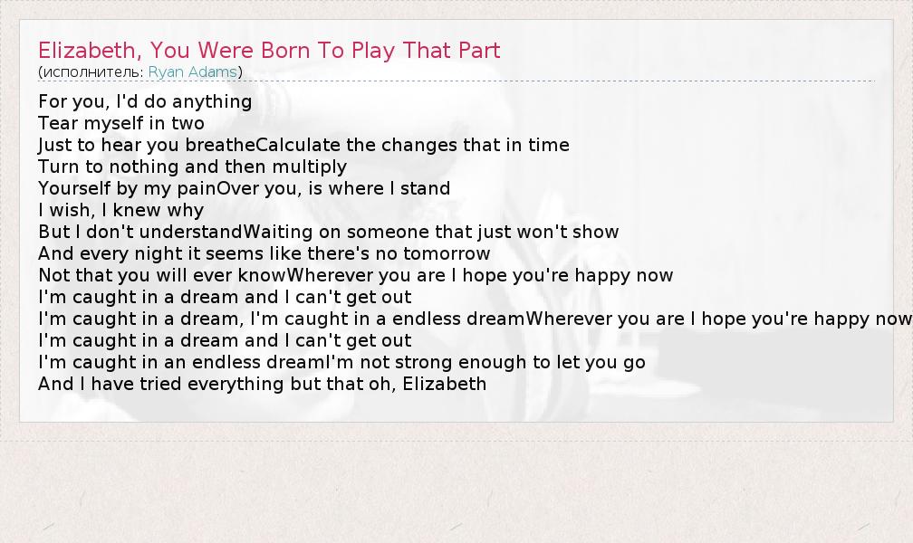 ГлавнаяИсполнителиRyan AdamsElizabeth, You Were Born To Play That Part