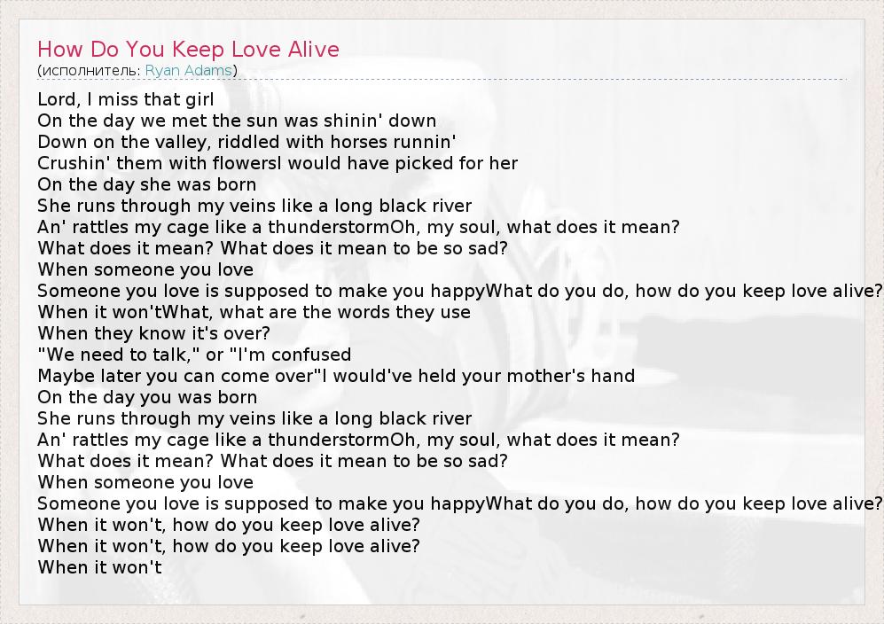 Lord, I miss that girl On the day we met the sun was shinin' down Down on the valley, riddled with horses runnin' Crushin' them with flowersI would have picked for her On the day she was born She runs through my veins like a long black river An' rattles my cage like a thunderstormOh, my soul, what does it mean? What does it mean? What does it mean to be so sad? When someone you love Someone you love is supposed to make you happyWhat do you do, how do you keep love alive? When it won'tWhat, what are the words they use When they know it's over? "We need to talk," or "I'm confused Maybe later you can come over"I would've held your mother's hand On the day you was born She runs through my veins like a long black river An' rattles my cage like a thunderstormOh, my soul, what does it mean? What does it mean? What does it mean to be so sad? When someone you love Someone you love is supposed to make you happyWhat do you do, how do you keep love alive? When it won't, how do you keep love alive? When it won't, how do you keep love alive? When it won't