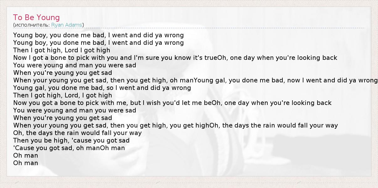 When your young you get sad, then you get high, oh manYoung gal, you done me bad, now I went and did ya wrong