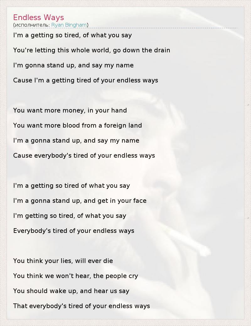 I'm a getting so tired, of what you say You're letting this whole world, go down the drain I'm gonna stand up, and say my name Cause I'm a getting tired of your endless ways You want more money, in your hand You want more blood from a foreign land I'm a gonna stand up, and say my name Cause everybody's tired of your endless ways I'm a getting so tired of what you say I'm a gonna stand up, and get in your face I'm getting so tired, of what you say Everybody's tired of your endless ways You think your lies, will ever die You think we won't hear, the people cry You should wake up, and hear us say That everybody's tired of your endless ways