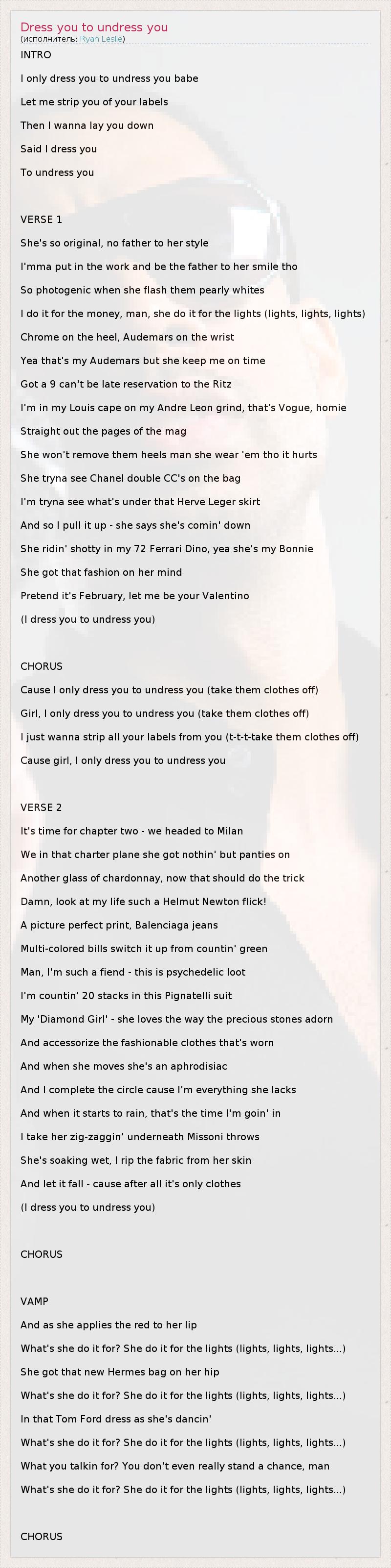 INTRO I only dress you to undress you babe Let me strip you of your labels Then I wanna lay you down Said I dress you To undress you VERSE 1 She's so original, no father to her style I'mma put in the work and be the father to her smile tho So photogenic when she flash them pearly whites I do it for the money, man, she do it for the lights (lights, lights, lights) Chrome on the heel, Audemars on the wrist Yea that's my Audemars but she keep me on time Got a 9 can't be late reservation to the Ritz I'm in my Louis cape on my Andre Leon grind, that's Vogue, homie Straight out the pages of the mag She won't remove them heels man she wear 'em tho it hurts She tryna see Chanel double CC's on the bag I'm tryna see what's under that Herve Leger skirt And so I pull it up - she says she's comin' down She ridin' shotty in my 72 Ferrari Dino, yea she's my Bonnie She got that fashion on her mind Pretend it's February, let me be your Valentino (I dress you to undress you) CHORUS Cause I only dress you to undress you (take them clothes off) Girl, I only dress you to undress you (take them clothes off) I just wanna strip all your labels from you (t-t-t-take them clothes off) Cause girl, I only dress you to undress you VERSE 2 It's time for chapter two - we headed to Milan We in that charter plane she got nothin' but panties on Another glass of chardonnay, now that should do the trick Damn, look at my life such a Helmut Newton flick! A picture perfect print, Balenciaga jeans Multi-colored bills switch it up from countin' green Man, I'm such a fiend - this is psychedelic loot I'm countin' 20 stacks in this Pignatelli suit My 'Diamond Girl' - she loves the way the precious stones adorn And accessorize the fashionable clothes that's worn And when she moves she's an aphrodisiac And I complete the circle cause I'm everything she lacks And when it starts to rain, that's the time I'm goin' in I take her zig-zaggin' underneath Missoni throws She's soaking wet, I rip the fabric from her skin And let it fall - cause after all it's only clothes (I dress you to undress you) CHORUS VAMP And as she applies the red to her lip What's she do it for? She do it for the lights (lights, lights, lights...) She got that new Hermes bag on her hip What's she do it for? She do it for the lights (lights, lights, lights...) In that Tom Ford dress as she's dancin' What's she do it for? She do it for the lights (lights, lights, lights...) What you talkin for? You don't even really stand a chance, man What's she do it for? She do it for the lights (lights, lights, lights...) CHORUS