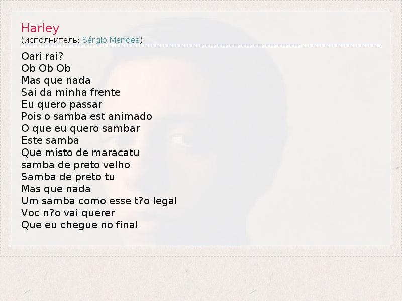 Это интересно:Он родился в бразильском городке Нитерой (Niteroi), в семье врача. Еще совсем мальчишкой начал заниматься музыкой в местной консерватории и мечтал стать профессиональным пианистом. Но стоило семье переехать в столицу Рио-де Жанейро, как 15-летний Серхио бросил занятия по классической музыке, променяв увертюры и сюиты на зажигательные ритмы тогда еще совсем нового музыкального направления... продолжение