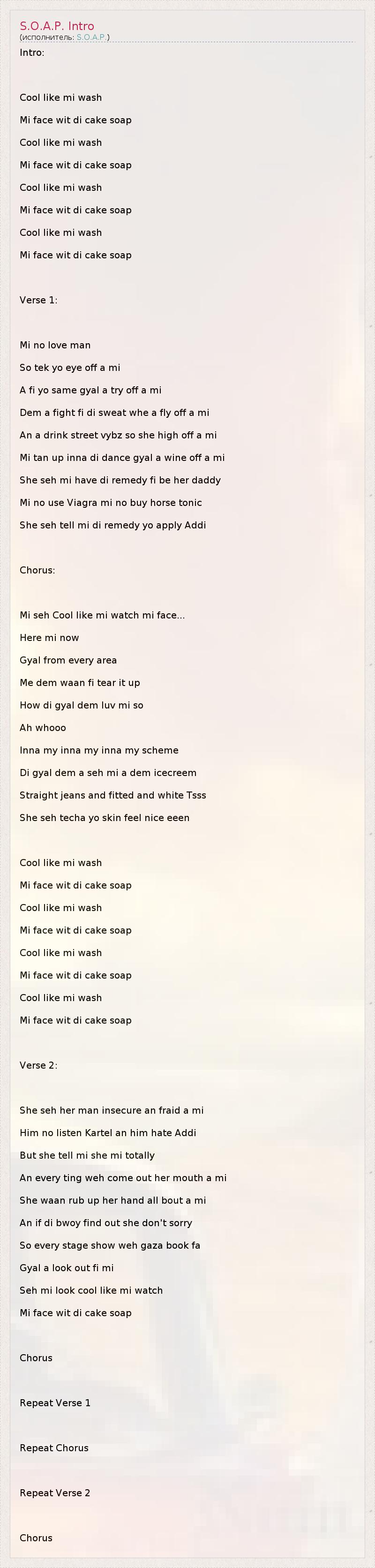 Intro: Cool like mi wash Mi face wit di cake soap Cool like mi wash Mi face wit di cake soap Cool like mi wash Mi face wit di cake soap Cool like mi wash Mi face wit di cake soap Verse 1: Mi no love man So tek yo eye off a mi A fi yo same gyal a try off a mi Dem a fight fi di sweat whe a fly off a mi An a drink street vybz so she high off a mi Mi tan up inna di dance gyal a wine off a mi She seh mi have di remedy fi be her daddy Mi no use Viagra mi no buy horse tonic She seh tell mi di remedy yo apply Addi Chorus: Mi seh Cool like mi watch mi face... Here mi now Gyal from every area Me dem waan fi tear it up How di gyal dem luv mi so Ah whooo Inna my inna my inna my scheme Di gyal dem a seh mi a dem icecreem Straight jeans and fitted and white Tsss She seh techa yo skin feel nice eeen Cool like mi wash Mi face wit di cake soap Cool like mi wash Mi face wit di cake soap Cool like mi wash Mi face wit di cake soap Cool like mi wash Mi face wit di cake soap Verse 2: She seh her man insecure an fraid a mi Him no listen Kartel an him hate Addi But she tell mi she mi totally An every ting weh come out her mouth a mi She waan rub up her hand all bout a mi An if di bwoy find out she don't sorry So every stage show weh gaza book fa Gyal a look out fi mi Seh mi look cool like mi watch Mi face wit di cake soap Chorus Repeat Verse 1 Repeat Chorus Repeat Verse 2 Chorus