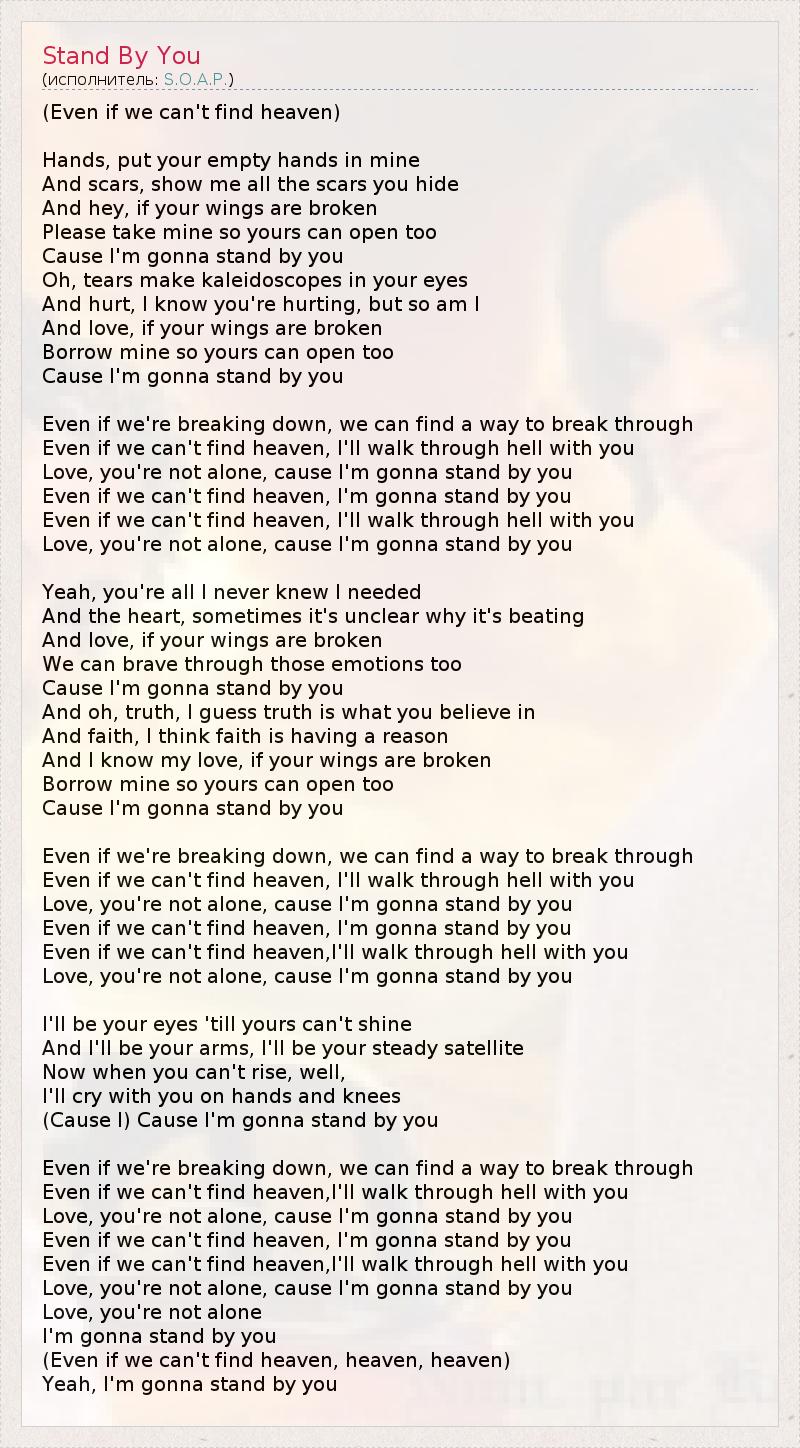 (Even if we can't find heaven) Hands, put your empty hands in mine And scars, show me all the scars you hide And hey, if your wings are broken Please take mine so yours can open too Cause I'm gonna stand by you Oh, tears make kaleidoscopes in your eyes And hurt, I know you're hurting, but so am I And love, if your wings are broken Borrow mine so yours can open too Cause I'm gonna stand by you Even if we're breaking down, we can find a way to break through Even if we can't find heaven, I'll walk through hell with you Love, you're not alone, cause I'm gonna stand by you Even if we can't find heaven, I'm gonna stand by you Even if we can't find heaven, I'll walk through hell with you Love, you're not alone, cause I'm gonna stand by you Yeah, you're all I never knew I needed And the heart, sometimes it's unclear why it's beating And love, if your wings are broken We can brave through those emotions too Cause I'm gonna stand by you And oh, truth, I guess truth is what you believe in And faith, I think faith is having a reason And I know my love, if your wings are broken Borrow mine so yours can open too Cause I'm gonna stand by you Even if we're breaking down, we can find a way to break through Even if we can't find heaven, I'll walk through hell with you Love, you're not alone, cause I'm gonna stand by you Even if we can't find heaven, I'm gonna stand by you Even if we can't find heaven,I'll walk through hell with you Love, you're not alone, cause I'm gonna stand by you I'll be your eyes 'till yours can't shine And I'll be your arms, I'll be your steady satellite Now when you can't rise, well, I'll cry with you on hands and knees (Cause I) Cause I'm gonna stand by you Even if we're breaking down, we can find a way to break through Even if we can't find heaven,I'll walk through hell with you Love, you're not alone, cause I'm gonna stand by you Even if we can't find heaven, I'm gonna stand by you Even if we can't find heaven,I'll walk through hell with you Love, you're not alone, cause I'm gonna stand by you Love, you're not alone I'm gonna stand by you (Even if we can't find heaven, heaven, heaven) Yeah, I'm gonna stand by you