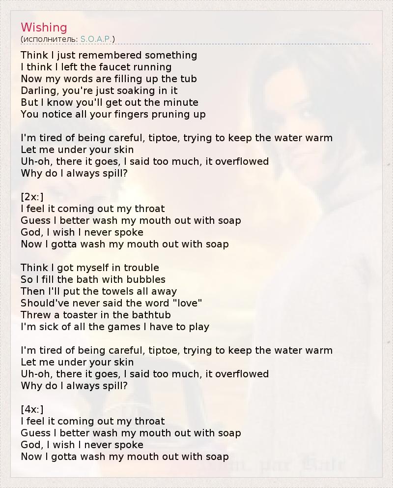 Кажется, я вспомнила, Кажется, я забыла выключить воду, И теперь мои слова заполняют ванную. Дорогой, ты в ней просто нежишься, Но я знаю, что ты вылезешь, как только Заметишь, что кожа на пальцах начинает морщиться. Я устала осторожничать, ходить на цыпочках, пытаясь не дать воде замерзнуть, Впусти меня в свою душу. Ой-ой, вот оно, я сболтнула лишнего, вода перелилась через край, Почему я всегда все выбалтываю? [2x:] Я чувствую, как слова лезут из горла, Наверное, стоит вымыть рот с мылом. Боже, лучше бы я молчала, Теперь придется вымыть рот с мылом. Кажется, я создала себе проблемы, Так что запущу в ванную мыльные пузыри И уберу все полотенца. Не стоило говорить слово "любовь", Кинула тостер в ванную, Я устала от этих игр, в которые должна играть. Я устала осторожничать, ходить на цыпочках, пытаясь не дать воде замерзнуть, Впусти меня в свою душу. Ой-ой, вот оно, я сболтнула лишнего, вода перелилась через край, Почему я всегда все выбалтываю? [4x:] Я чувствую, как слова лезут из горла, Наверное, стоит вымыть рот с мылом. Боже, лучше бы я молчала, Теперь придется вымыть рот с мылом.