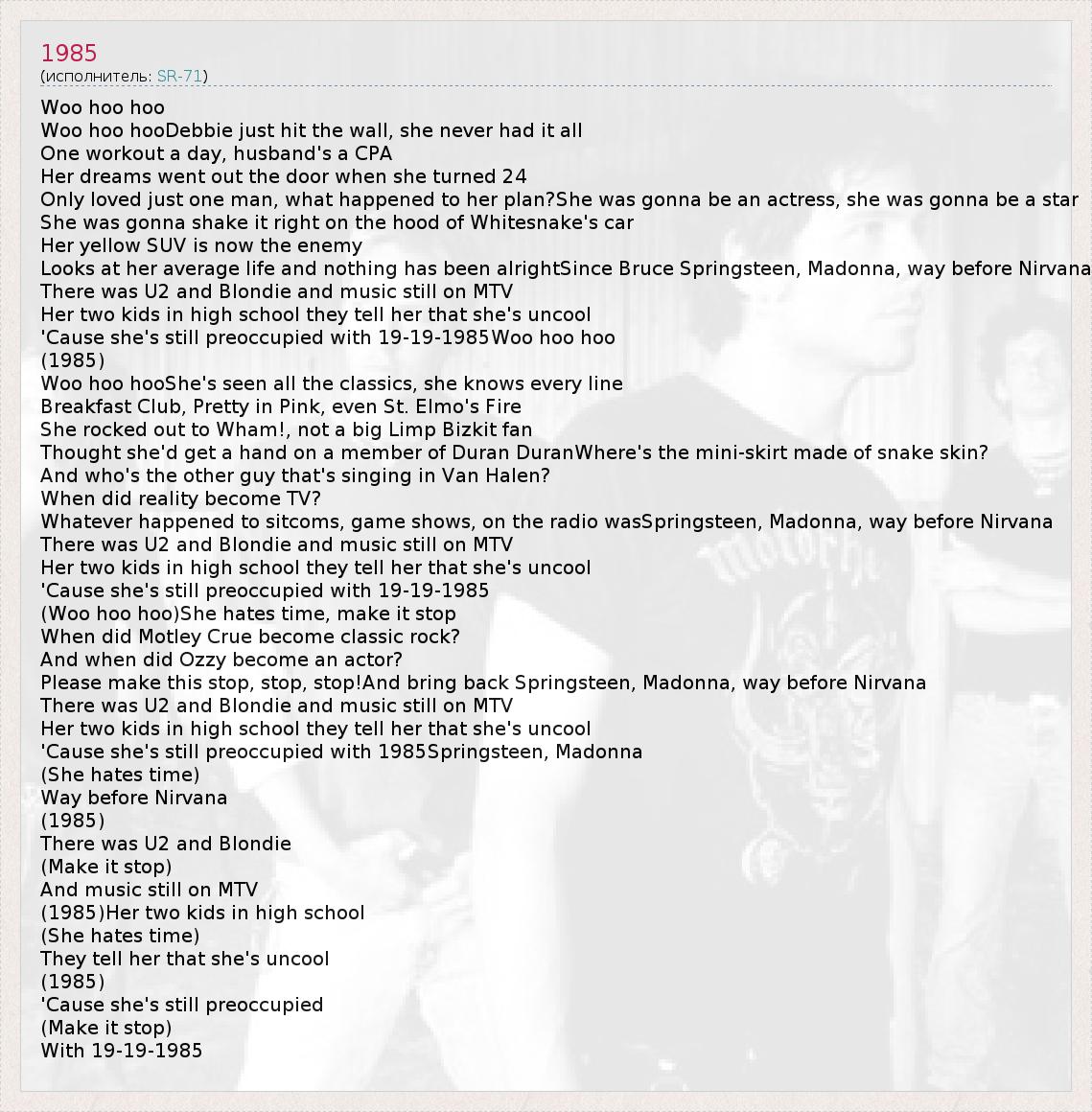 Это интересно:SR-71 – американская поп-панк-команда, сформированная в 1998 году в Балтиморе, штат Мэриленд. К самым известным их творениям отностятся сингл 2000 года "Right Now", сингл "Tomorrow"(2002), а также SR-71 известны как авторы первоначального варианта песни-хита группы Bowling For Soup – "1985". Название группы пошло от наименования одного из достижений американской военной технологии-SR-71 Blackbird, сверхзвукового... продолжение