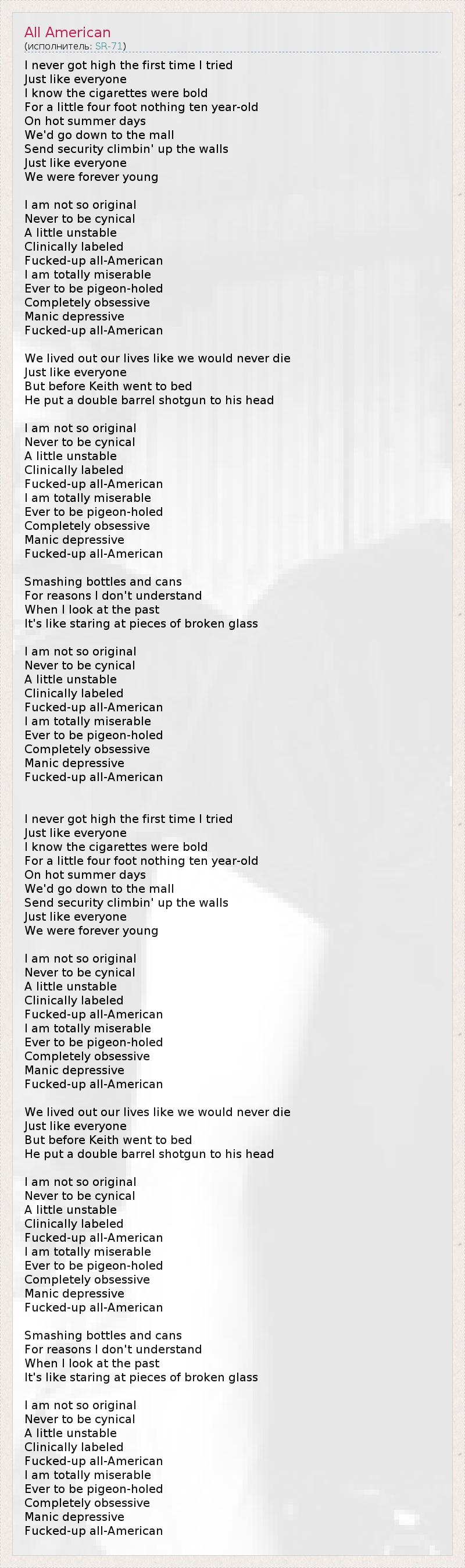 Это интересно:SR-71 – американская поп-панк-команда, сформированная в 1998 году в Балтиморе, штат Мэриленд. К самым известным их творениям отностятся сингл 2000 года "Right Now", сингл "Tomorrow"(2002), а также SR-71 известны как авторы первоначального варианта песни-хита группы Bowling For Soup – "1985". Название группы пошло от наименования одного из достижений американской военной технологии-SR-71 Blackbird, сверхзвукового... продолжение