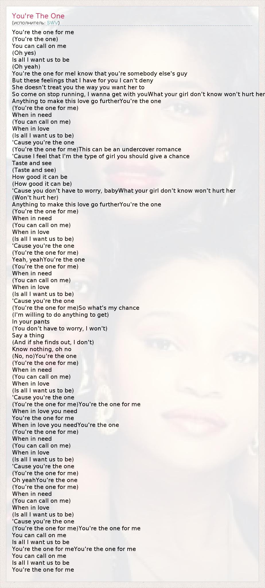 Это интересно:Группа SWV (аббревиатура от Sisters With Voices) состоит из трех школьных подруг: Coko (Cheryl Gamble), Taj (Tamara Johnson) и Lelee (Leanne Lyons).Все три вокалистки в детстве пели в церкви, где и научились гармонии. Их демо кассета заинтересовала продюсера Teddy Riley, бывшего участника группы Guy и, спорно, основоположника стиля по названием New Jack Swing.До SWV Riley помог сделать карьеру группе Jodeci и певице Mary J. Blige. Удача Riley не покинула... продолжение