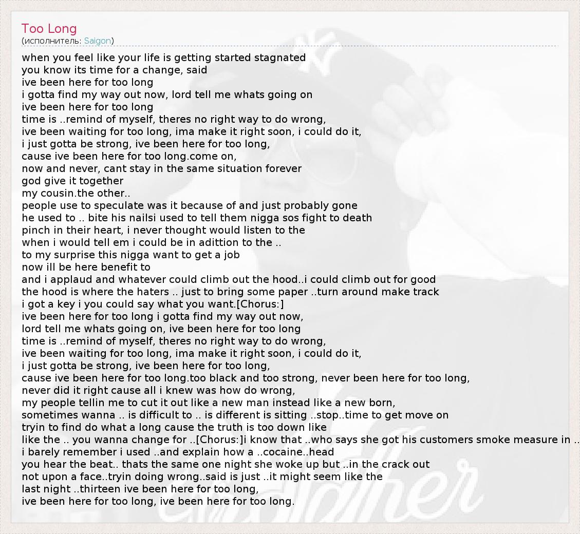 when you feel like your life is getting started stagnated you know its time for a change, said ive been here for too long i gotta find my way out now, lord tell me whats going on ive been here for too long time is ..remind of myself, theres no right way to do wrong, ive been waiting for too long, ima make it right soon, i could do it, i just gotta be strong, ive been here for too long, cause ive been here for too long.come on, now and never, cant stay in the same situation forever god give it together my cousin.the other.. people use to speculate was it because of and just probably gone he used to .. bite his nailsi used to tell them nigga sos fight to death pinch in their heart, i never thought would listen to the when i would tell em i could be in adittion to the .. to my surprise this nigga want to get a job now ill be here benefit to and i applaud and whatever could climb out the hood..i could climb out for good the hood is where the haters .. just to bring some paper ..turn around make track i got a key i you could say what you want.[Chorus:] ive been here for too long i gotta find my way out now, lord tell me whats going on, ive been here for too long time is ..remind of myself, theres no right way to do wrong, ive been waiting for too long, ima make it right soon, i could do it, i just gotta be strong, ive been here for too long, cause ive been here for too long.too black and too strong, never been here for too long, never did it right cause all i knew was how do wrong, my people tellin me to cut it out like a new man instead like a new born, sometimes wanna .. is difficult to .. is different is sitting ..stop..time to get move on tryin to find do what a long cause the truth is too down like like the .. you wanna change for ..[Chorus:]i know that ..who says she got his customers smoke measure in .. i barely remember i used ..and explain how a ..cocaine..head you hear the beat.. thats the same one night she woke up but ..in the crack out not upon a face..tryin doing wrong..said is just ..it might seem like the last night ..thirteen ive been here for too long, ive been here for too long, ive been here for too long.