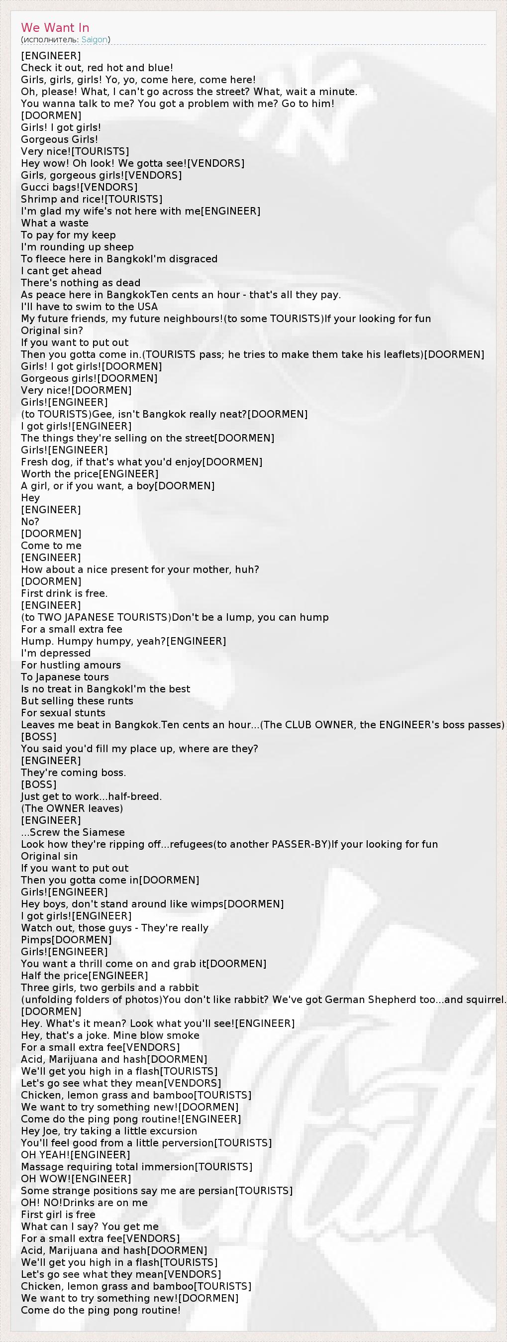 Leaves me beat in Bangkok.Ten cents an hour...(The CLUB OWNER, the ENGINEER's boss passes)