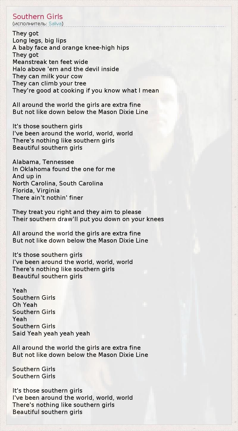 They got Long legs, big lips A baby face and orange knee-high hips They got Meanstreak ten feet wide Halo above 'em and the devil inside They can milk your cow They can climb your tree They're good at cooking if you know what I mean All around the world the girls are extra fine But not like down below the Mason Dixie Line It's those southern girls I've been around the world, world, world There's nothing like southern girls Beautiful southern girls Alabama, Tennessee In Oklahoma found the one for me And up in North Carolina, South Carolina Florida, Virginia There ain't nothin' finer They treat you right and they aim to please Their southern draw'll put you down on your knees All around the world the girls are extra fine But not like down below the Mason Dixie Line It's those southern girls I've been around the world, world, world There's nothing like southern girls Beautiful southern girls Yeah Southern Girls Oh Yeah Southern Girls Yeah Southern Girls Said Yeah yeah yeah yeah All around the world the girls are extra fine But not like down below the Mason Dixie Line Southern Girls Southern Girls It's those southern girls I've been around the world, world, world There's nothing like southern girls Beautiful southern girls