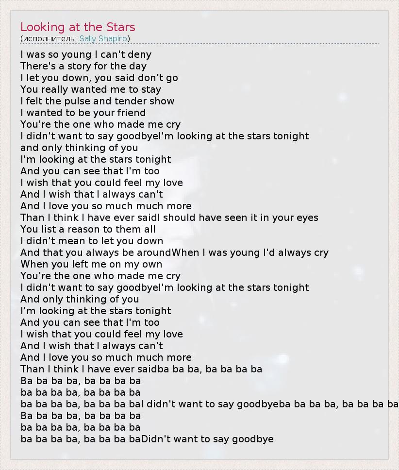I was so young I can't deny There's a story for the day I let you down, you said don't go You really wanted me to stay I felt the pulse and tender show I wanted to be your friend You're the one who made me cry I didn't want to say goodbyeI'm looking at the stars tonight and only thinking of you I'm looking at the stars tonight And you can see that I'm too I wish that you could feel my love And I wish that I always can't And I love you so much much more Than I think I have ever saidI should have seen it in your eyes You list a reason to them all I didn't mean to let you down And that you always be aroundWhen I was young I'd always cry When you left me on my own You're the one who made me cry I didn't want to say goodbyeI'm looking at the stars tonight And only thinking of you I'm looking at the stars tonight And you can see that I'm too I wish that you could feel my love And I wish that I always can't And I love you so much much more Than I think I have ever saidba ba ba, ba ba ba ba Ba ba ba ba, ba ba ba ba ba ba ba ba, ba ba ba ba ba ba ba ba, ba ba ba baI didn't want to say goodbyeba ba ba ba, ba ba ba ba Ba ba ba ba, ba ba ba ba ba ba ba ba, ba ba ba ba ba ba ba ba, ba ba ba baDidn't want to say goodbye