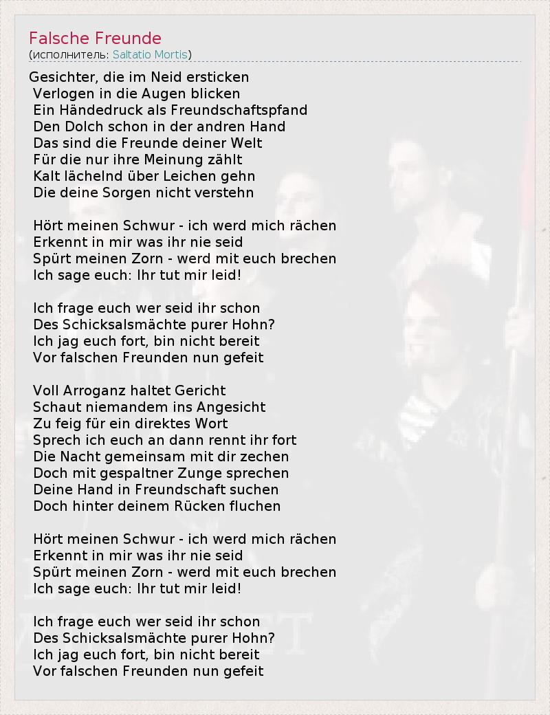 Лица, которые захлёбываются завистью, смотрят лживым взглядом. Рукопожатие как залог дружбы, Кинжал держат в другой руке. Это и есть друзья этого мира, Для которых лишь своё мнение важно, Холодно смеясь, идут по трупам, Не понимают твоих забот. Услышьте мою клятву – Я отомщу за себя. Признайте во мне того, кем вы никогда не будете. Почувствуйте мой гнев – Я покончу с вами, Я говорю вам: Вы причиняете мне боль! Я спрашиваю вас, кто же вы, Насмешка судьбоносных сил? Я прогоню вас, не готов с вами иметь дело, От фальшивых друзей теперь неуязвим. Надменно творящие суд, Никому не смотрящие в лицо, Слишком трусливые для прямоты Требую, бегите прочь! Ночью вместе с тобой пируют, Но говорят раздвоенным языком. Твоего дружеского рукопожатия ищут, Но за твоей спиной проклинают тебя.