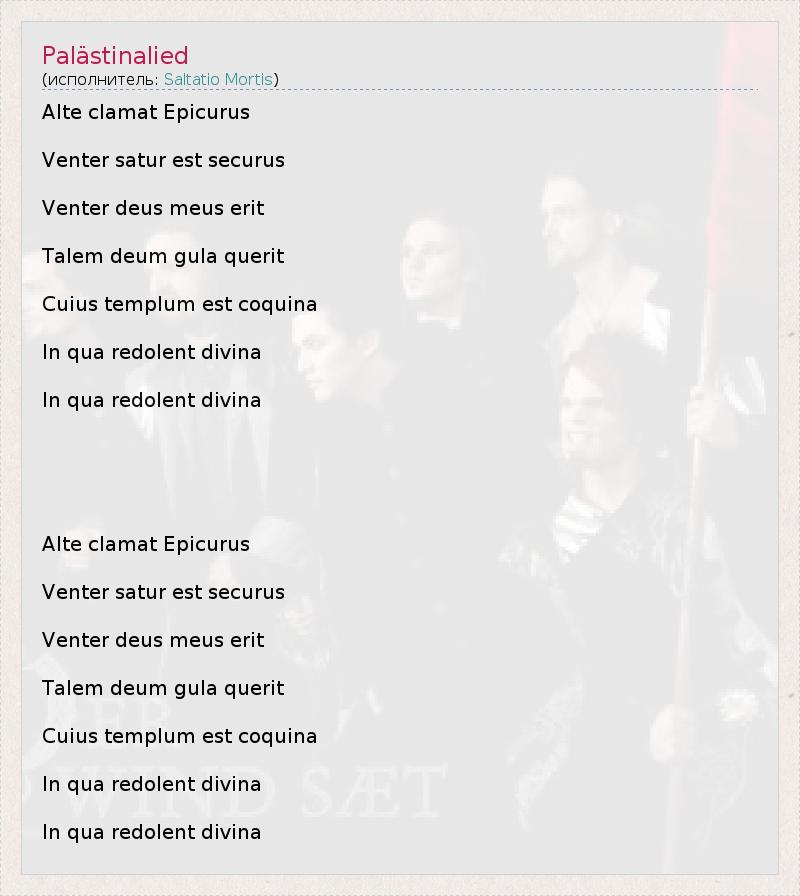 Alte clamat Epicurus Venter satur est securus Venter deus meus erit Talem deum gula querit Cuius templum est coquina In qua redolent divina In qua redolent divina Alte clamat Epicurus Venter satur est securus Venter deus meus erit Talem deum gula querit Cuius templum est coquina In qua redolent divina In qua redolent divina