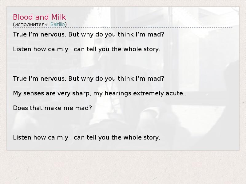 True I'm nervous. But why do you think I'm mad? Listen how calmly I can tell you the whole story. True I'm nervous. But why do you think I'm mad? My senses are very sharp, my hearings extremely acute.. Does that make me mad? Listen how calmly I can tell you the whole story.