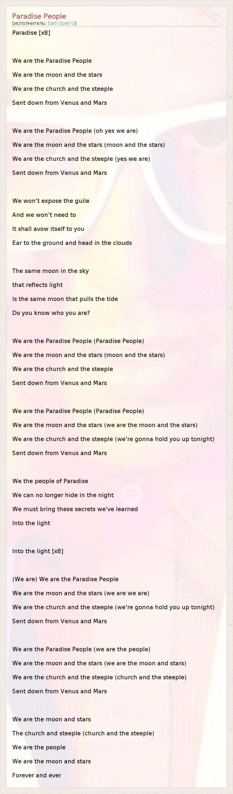 Это интересно:Cэм Спарро (англ. Sam Sparro урожденный Sam Falson родился 8 ноября 1982 года) - австралийский продюсер, композитор и певец. Сэм родился в Сиднее в семье известного певца Криса Фелсона (Chris Falson). Ещё совсем ребёнком он уехал вместе с отцом в Лос-Анджелес, где тот записывал свой соул-альбом. Они вместе посещали самые крупные церкви, наслаждаясь пением лучших исполнителей в стиле госпел, служивших... продолжение
