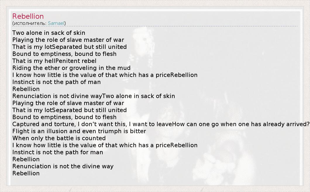 Это интересно:Samael — музыкальный коллектив из Швейцарии, творчество которого начиналось как разновидность блэк-метала. Впоследствии стиль группы претерпел изменения и творческая деятельность Samael развивалась в направлении индастриал-метал.Начало группы, блэк-металический периодГруппа Samael была создана в 1987 году в Сьоне (Швейцария). Основатели группы — братья, известные как Vorph (вокал, гитара)... продолжение