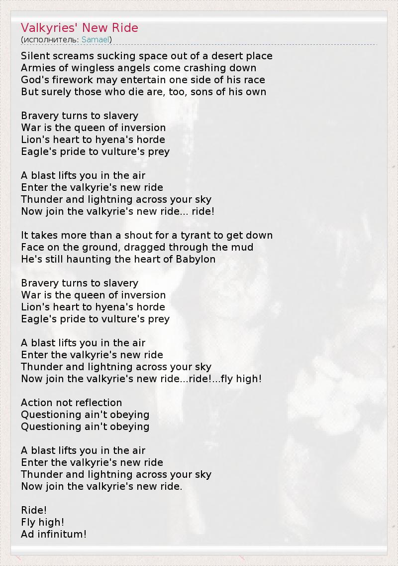Тихие крики высасывают пространство из пустынного места: C неба обрушиваются армии бескрылых ангелов. Может, божественный салют предназначен для части Божьих созданий, Но смертные, конечно же, тоже его дети. Храбрость становится рабством, На войне - королеве перестановок. Львиное сердце превращается в стаю гиен, Орлиная гордость падает жертвой стервятников. Сильный порыв поднимает тебя в воздух, Присоединяйся к полёту валькирий! Гром и молнии в небесах - Присоединяйся к полёту валькирий. Лети! Для того, чтобы свергнуть тирана нужно больше, чем крик. Лицом на земле, втоптанным в грязь, Он всё ещё тревожит сердце Вавилона. Храбрость становится рабством, На войне - королеве перестановок. Львиное сердце превращается в стаю гиен, Орлиная гордость падает жертвой стервятников. Сильный порыв поднимает тебя в воздух, Присоединяйся к полёту валькирий! Гром и молнии в небесах - Присоединяйся к полёту валькирий. Лети! Лети выше! Действие - не размышление. Сомнение - не повиновение, Сомнение - не повиновение. Сильный порыв поднимает тебя в воздух, Присоединяйся к полёту валькирий! Гром и молнии в небесах - Присоединяйся к полёту валькирий. Лети! Лети выше! Лети! Лети выше! К вечности!