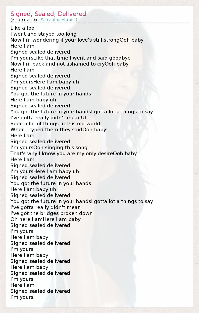 ГлавнаяИсполнителиSamantha MumbaSigned, Sealed, Delivered
