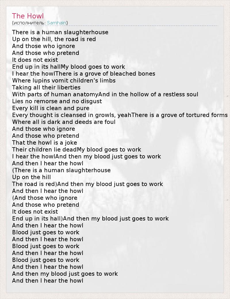 There is a human slaughterhouse Up on the hill, the road is red And those who ignore And those who pretend It does not exist End up in its hallMy blood goes to work I hear the howlThere is a grove of bleached bones Where lupins vomit children's limbs Taking all their liberties With parts of human anatomyAnd in the hollow of a restless soul Lies no remorse and no disgust Every kill is clean and pure Every thought is cleansed in growls, yeahThere is a grove of tortured forms Where all is dark and deeds are foul And those who ignore And those who pretend That the howl is a joke Their children lie deadMy blood goes to work I hear the howlAnd then my blood just goes to work And then I hear the howl (There is a human slaughterhouse Up on the hill The road is red)And then my blood just goes to work And then I hear the howl (And those who ignore And those who pretend It does not exist End up in its hall)And then my blood just goes to work And then I hear the howl Blood just goes to work And then I hear the howl Blood just goes to work And then I hear the howl Blood just goes to work And then I hear the howl And then my blood just goes to work And then I hear the howl