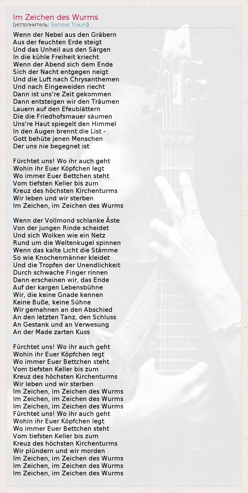 Венна дер Nebel AUS -ден- Граберн Aus дер feuchten Erde steigt Und Das Unheil AUS -ден- Sargen В умирают Kühle Freiheit kriecht Венна дер Abend Сич дем Ende Сич дер Nacht entgegen neigt Und умереть Luft нах Chrysanthemen Und нач Eingeweiden riecht Данн IST uns're gekommen Zeit Данн entsteigen Wir ден Träumen Lauern Auf ден Efeublättern Die умереть Friedhofsmauer säumen Uns're Haut spiegelt ден Himmel В логове Augen Brennt умереть List - Gott behüte jenen Menschen Der UNS ние begegnet IST Fürchtet UNS ! Wo ММСП ОШ Geht Wohin ММСП Euer Köpfchen legt Wo Immer Euer Bettchen steht Vom tiefsten Келлер бис Zum Kreuz -де- höchsten Kirchenturms Wir Leben унд Wir Sterben Im Zeichen , им Zeichen де Wurms Венна дер Vollmond schlanke Aste Фон дер Jungen Rinde scheidet Und Сич Wolken Wie Эйн Netz Рунд мкм умереть Weltenkugel Spinnen Венна дас Kalte Licht умереть Stämme Так Wie Knochenmänner kleidet Und умереть Tropfen дер Unendlichkeit Durch schwache Finger rinnen Данн erscheinen Wir , Das Ende Auf Der kargen Lebensbühne Wir , умирают Keine Gnade KENNEN Keine Буссе , Keine Sühne Wir gemahnen в логово Abschied Ден letzten Tanz , ден Schluss Gestank ундVerwesung Дер Сделано zarten Kuss Fürchtet UNS ! Wo ММСП ОШ Geht Wohin ММСП Euer Köpfchen legt Wo Immer Euer Bettchen steht Vom tiefsten Келлер бис Zum Kreuz -де- höchsten Kirchenturms Wir Leben унд Wir Sterben Im Zeichen , им Zeichen де Wurms Im Zeichen , им Zeichen де Wurms Im Zeichen , им Zeichen де Wurms Fürchtet UNS ! Wo ММСП ОШ Geht Wohin ММСП Euer Köpfchen legt Wo Immer Euer Bettchen steht Vom tiefsten Келлер бис Zum Kreuz -де- höchsten Kirchenturms Wir plündern унд Wir Морден Im Zeichen , им Zeichen де Wurms Im Zeichen , им Zeichen де Wurms Im Zeichen , им Zeichen де Wurms