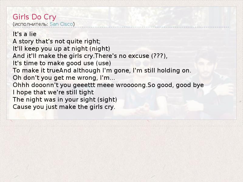 А как ты думаешь, о чем песня "Girls Do Cry" ?