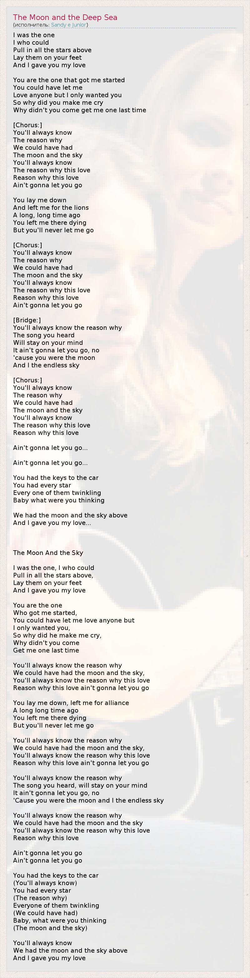 Я была той единственной, Которая могла Собрать все звезды с неба И положить их к твоим ногам, И я отдала тебе всю мою любовь с ними... Ты был моей первой искренней любовью И ты мог бы сказать мне Любить любого другого, но мне нужен был только ты. Так почему же ты заставил меня плакать? Почему ты не пришел за мной в тот последний раз? [Припев:] Ты всегда будешь помнить Причину, по которой Мы могли бы владеть вместе Луной и небом – нашу любовь... Ты всегда будешь помнить Причину, по которой эта любовь Причину, по которой эта любовь Никогда не покинет твоё сердце. Ты предал меня, оставил одну На растерзание злорадным завистникам. Давно, когда-то очень давно Ты оставил меня там умирать от тоски, Но ты никогда не позволишь мне забыть тебя. [Припев:] Ты всегда будешь помнить Причину, по которой Мы могли бы владеть вместе Луной и небом – нашу любовь... Ты всегда будешь помнить Причину, по которой эта любовь Причину, по которой эта любовь Никогда не покинет твоё сердце. [Переход:] Ты всегда будешь знать почему, Услышанная знакомая песня Будет беспрестанно звучать в твоем сердце. Она не покинет обитель, Потому что ты был той Луной А я была бескрайним Небом. [Припев:] Ты всегда будешь помнить Причину, по которой Мы могли бы владеть вместе Луной и небом – нашу любовь... Ты всегда будешь помнить Причину, по которой эта любовь Причину, по которой эта любовь Никогда не покинет твоё сердце... Никогда не покинет твоё сердце... У тебя были ключи от моего сердца... Все звезды были у твоих ног... Каждая из них мерцала... Малыш, чем же ты думал... У нас была луна и бескрайнее небо над нами... И я отдала тебе всю мою любовь... Луна и небо (перевод Элла Дементьева из Уссурийска) Я была единственной, кто мог Притянуть звезды с небес И положить их к твоим ногам, Так я подарила тебе и свою любовь Ты единственный, Кто дал мне почувствовать вкус к жизни, Ты мог бы позволить мне любить кого угодно, Но мне был нужен лишь ты, Так почему же я плачу из-за него? Почему ты не пытаешься Понять меня в последний раз? Ты всегда будешь знать, почему Мы могли бы владеть луной и небом, Ты всегда будешь знать, почему эта любовь, Почему эта любовь тебя не отпустит Ты сломил меня и разорвал нашу связь, Давным-давно, Ты оставил меня здесь умирать, Но ты никогда меня не отпустишь Ты всегда будешь знать, почему Мы могли бы владеть луной и небом, Ты всегда будешь знать, почему эта любовь, Почему эта любовь тебя не отпустит Ты всегда будешь знать, почему Песня, которую ты слышал, запомнится тебе И не отпустит, нет... Потому что ты был луной, а я бескрайним небом Ты всегда будешь знать, почему Мы могли бы владеть луной и небом, Ты всегда будешь знать, почему эта любовь, Почему эта любовь... ...тебя не отпустит, Тебя не отпустит У тебя был ключ, (Ты всегда будешь знать) Ты владел каждой звездой (Почему) Они все мерцают, (Мы могли бы владеть) Малыш, о чём ты думал? (Луной и небом) Ты всегда будешь знать, Мы владели луной и небом, И я отдала тебе свою любовь