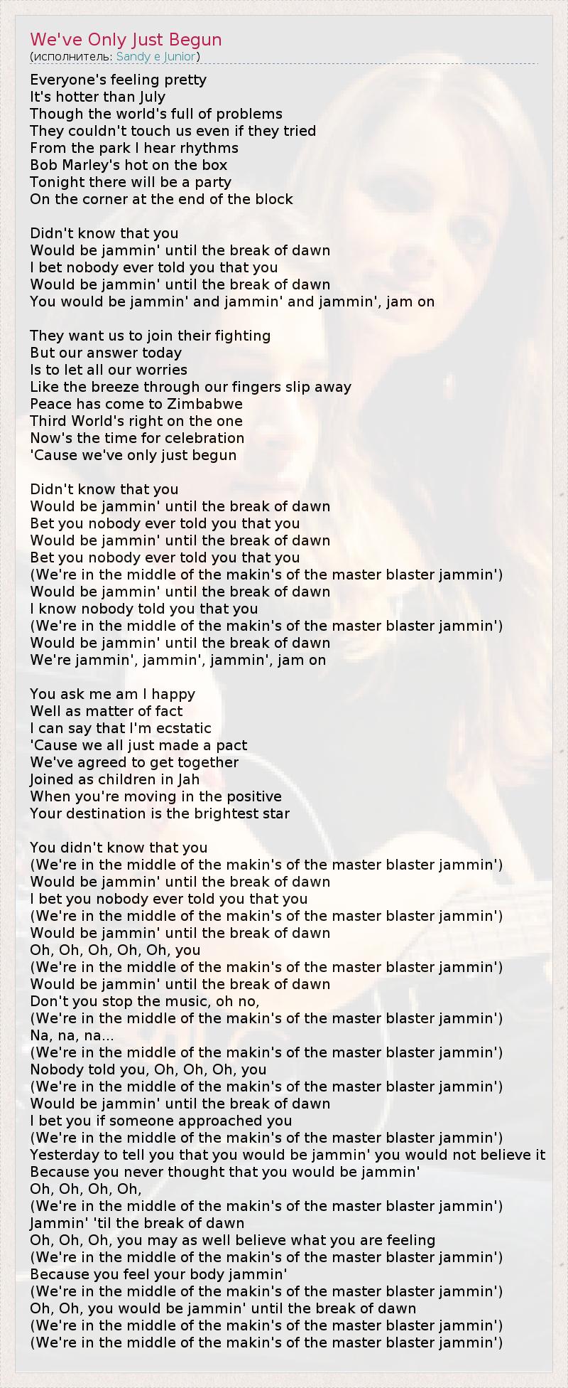 Everyone's feeling pretty It's hotter than July Though the world's full of problems They couldn't touch us even if they tried From the park I hear rhythms Bob Marley's hot on the box Tonight there will be a party On the corner at the end of the block Didn't know that you Would be jammin' until the break of dawn I bet nobody ever told you that you Would be jammin' until the break of dawn You would be jammin' and jammin' and jammin', jam on They want us to join their fighting But our answer today Is to let all our worries Like the breeze through our fingers slip away Peace has come to Zimbabwe Third World's right on the one Now's the time for celebration 'Cause we've only just begun Didn't know that you Would be jammin' until the break of dawn Bet you nobody ever told you that you Would be jammin' until the break of dawn Bet you nobody ever told you that you (We're in the middle of the makin's of the master blaster jammin') Would be jammin' until the break of dawn I know nobody told you that you (We're in the middle of the makin's of the master blaster jammin') Would be jammin' until the break of dawn We're jammin', jammin', jammin', jam on You ask me am I happy Well as matter of fact I can say that I'm ecstatic 'Cause we all just made a pact We've agreed to get together Joined as children in Jah When you're moving in the positive Your destination is the brightest star You didn't know that you (We're in the middle of the makin's of the master blaster jammin') Would be jammin' until the break of dawn I bet you nobody ever told you that you (We're in the middle of the makin's of the master blaster jammin') Would be jammin' until the break of dawn Oh, Oh, Oh, Oh, Oh, you (We're in the middle of the makin's of the master blaster jammin') Would be jammin' until the break of dawn Don't you stop the music, oh no, (We're in the middle of the makin's of the master blaster jammin') Na, na, na... (We're in the middle of the makin's of the master blaster jammin') Nobody told you, Oh, Oh, Oh, you (We're in the middle of the makin's of the master blaster jammin') Would be jammin' until the break of dawn I bet you if someone approached you (We're in the middle of the makin's of the master blaster jammin') Yesterday to tell you that you would be jammin' you would not believe it Because you never thought that you would be jammin' Oh, Oh, Oh, Oh, (We're in the middle of the makin's of the master blaster jammin') Jammin' 'til the break of dawn Oh, Oh, Oh, you may as well believe what you are feeling (We're in the middle of the makin's of the master blaster jammin') Because you feel your body jammin' (We're in the middle of the makin's of the master blaster jammin') Oh, Oh, you would be jammin' until the break of dawn (We're in the middle of the makin's of the master blaster jammin') (We're in the middle of the makin's of the master blaster jammin')