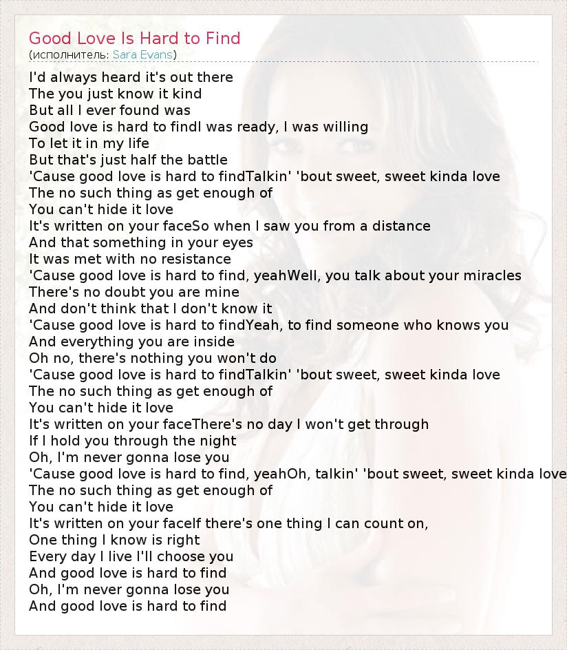 I'd always heard it's out there The you just know it kind But all I ever found was Good love is hard to findI was ready, I was willing To let it in my life But that's just half the battle 'Cause good love is hard to findTalkin' 'bout sweet, sweet kinda love The no such thing as get enough of You can't hide it love It's written on your faceSo when I saw you from a distance And that something in your eyes It was met with no resistance 'Cause good love is hard to find, yeahWell, you talk about your miracles There's no doubt you are mine And don't think that I don't know it 'Cause good love is hard to findYeah, to find someone who knows you And everything you are inside Oh no, there's nothing you won't do 'Cause good love is hard to findTalkin' 'bout sweet, sweet kinda love The no such thing as get enough of You can't hide it love It's written on your faceThere's no day I won't get through If I hold you through the night Oh, I'm never gonna lose you 'Cause good love is hard to find, yeahOh, talkin' 'bout sweet, sweet kinda love The no such thing as get enough of You can't hide it love It's written on your faceIf there's one thing I can count on, One thing I know is right Every day I live I'll choose you And good love is hard to find Oh, I'm never gonna lose you And good love is hard to find