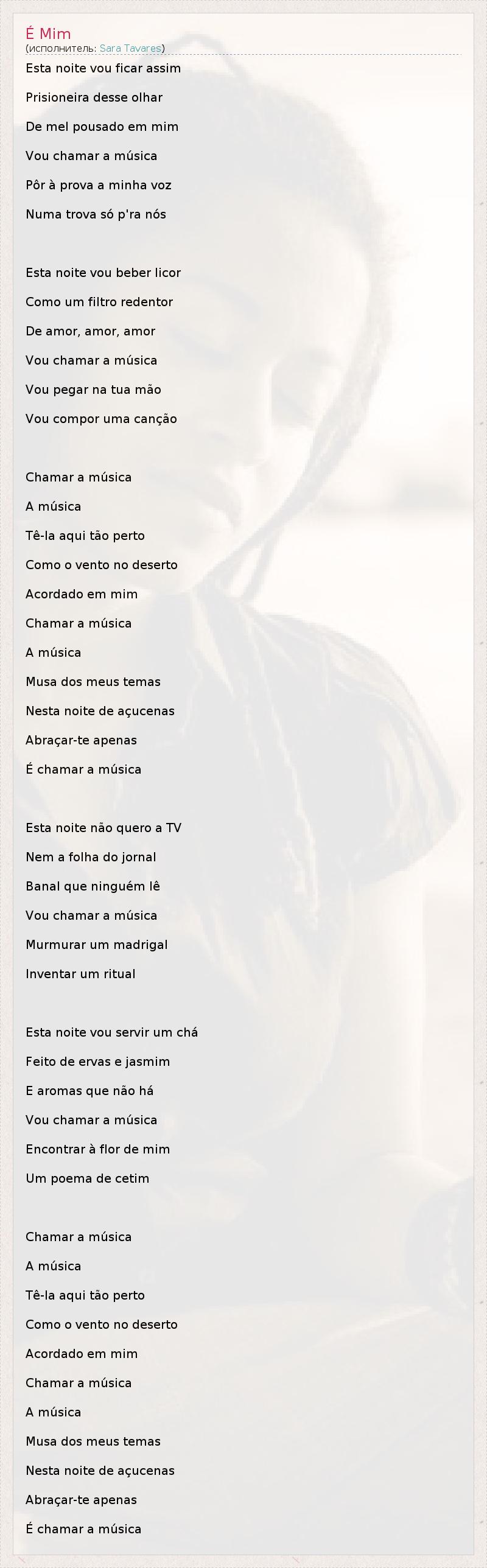 Это интересно:"Португальская певица Cара Таварес (Sara Tavares) привлекла к себе внимание дебютной работой “Balance” и, вне всякого сомнения, доставит удовольствие большинству поклонников разнообразной этнической музыки. Поклонники творчества Сесарии Эворы (Cesaria Evora) будут наслаждаться гладким и успокаивающим вокалом и ритмами родных мест певицы, которые эхом отзываются по всему альбому. Поклонники Manu... продолжение