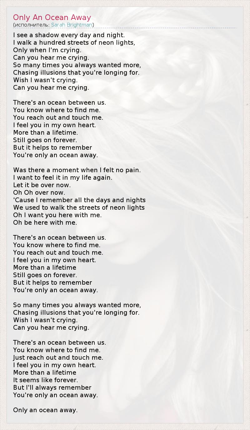 I see a shadow every day and night. I walk a hundred streets of neon lights, Only when I'm crying. Can you hear me crying. So many times you always wanted more, Chasing illusions that you're longing for. Wish I wasn't crying. Can you hear me crying. There's an ocean between us. You know where to find me. You reach out and touch me. I feel you in my own heart. More than a lifetime. Still goes on forever. But it helps to remember You're only an ocean away. Was there a moment when I felt no pain. I want to feel it in my life again. Let it be over now. Oh Oh over now. 'Cause I remember all the days and nights We used to walk the streets of neon lights Oh I want you here with me. Oh be here with me. There's an ocean between us. You know where to find me. You reach out and touch me. I feel you in my own heart. More than a lifetime Still goes on forever. But it helps to remember You're only an ocean away. So many times you always wanted more, Chasing illusions that you're longing for. Wish I wasn't crying. Can you hear me crying. There's an ocean between us. You know where to find me. Just reach out and touch me. I feel you in my own heart. More than a lifetime It seems like forever. But I'll always remember You're only an ocean away. Only an ocean away.