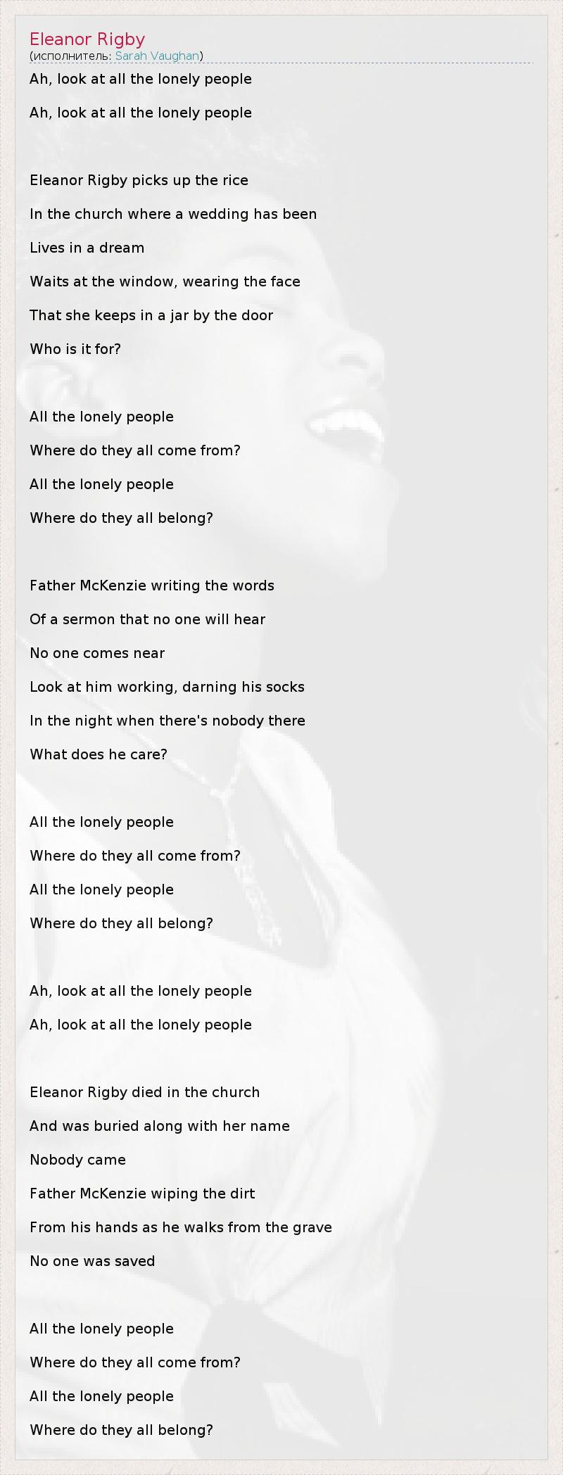 Ah, look at all the lonely people Ah, look at all the lonely people Eleanor Rigby picks up the rice In the church where a wedding has been Lives in a dream Waits at the window, wearing the face That she keeps in a jar by the door Who is it for? All the lonely people Where do they all come from? All the lonely people Where do they all belong? Father McKenzie writing the words Of a sermon that no one will hear No one comes near Look at him working, darning his socks In the night when there's nobody there What does he care? All the lonely people Where do they all come from? All the lonely people Where do they all belong? Ah, look at all the lonely people Ah, look at all the lonely people Eleanor Rigby died in the church And was buried along with her name Nobody came Father McKenzie wiping the dirt From his hands as he walks from the grave No one was saved All the lonely people Where do they all come from? All the lonely people Where do they all belong?
