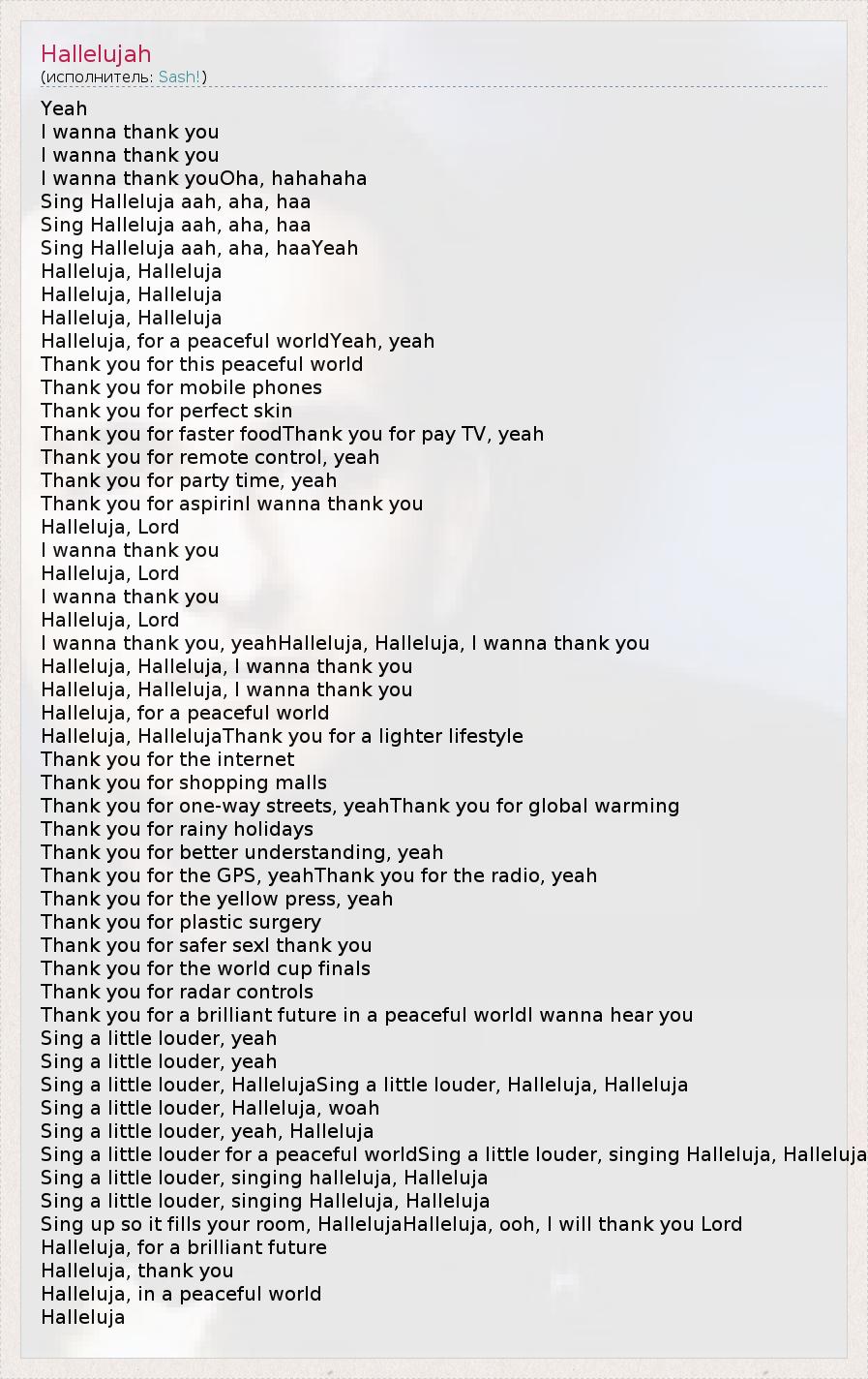 Yeah I wanna thank you I wanna thank you I wanna thank youOha, hahahaha Sing Halleluja aah, aha, haa Sing Halleluja aah, aha, haa Sing Halleluja aah, aha, haaYeah Halleluja, Halleluja Halleluja, Halleluja Halleluja, Halleluja Halleluja, for a peaceful worldYeah, yeah Thank you for this peaceful world Thank you for mobile phones Thank you for perfect skin Thank you for faster foodThank you for pay TV, yeah Thank you for remote control, yeah Thank you for party time, yeah Thank you for aspirinI wanna thank you Halleluja, Lord I wanna thank you Halleluja, Lord I wanna thank you Halleluja, Lord I wanna thank you, yeahHalleluja, Halleluja, I wanna thank you Halleluja, Halleluja, I wanna thank you Halleluja, Halleluja, I wanna thank you Halleluja, for a peaceful world Halleluja, HallelujaThank you for a lighter lifestyle Thank you for the internet Thank you for shopping malls Thank you for one-way streets, yeahThank you for global warming Thank you for rainy holidays Thank you for better understanding, yeah Thank you for the GPS, yeahThank you for the radio, yeah Thank you for the yellow press, yeah Thank you for plastic surgery Thank you for safer sexI thank you Thank you for the world cup finals Thank you for radar controls Thank you for a brilliant future in a peaceful worldI wanna hear you Sing a little louder, yeah Sing a little louder, yeah Sing a little louder, HallelujaSing a little louder, Halleluja, Halleluja Sing a little louder, Halleluja, woah Sing a little louder, yeah, Halleluja Sing a little louder for a peaceful worldSing a little louder, singing Halleluja, Halleluja Sing a little louder, singing halleluja, Halleluja Sing a little louder, singing Halleluja, Halleluja Sing up so it fills your room, HallelujaHalleluja, ooh, I will thank you Lord Halleluja, for a brilliant future Halleluja, thank you Halleluja, in a peaceful world Halleluja