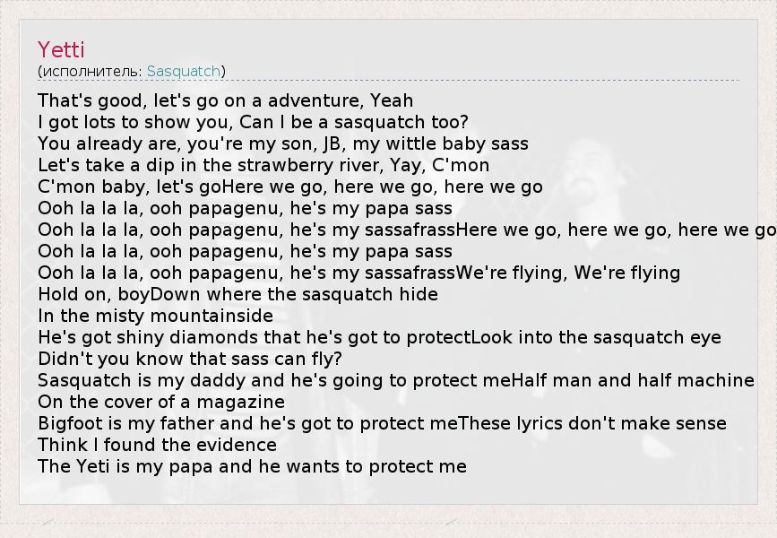 Bigfoot is my father and he's got to protect meThese lyrics don't make sense