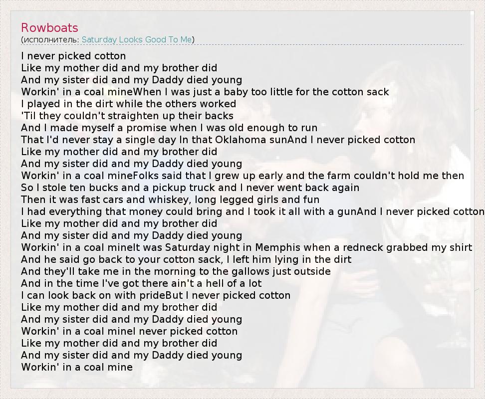 I never picked cotton Like my mother did and my brother did And my sister did and my Daddy died young Workin' in a coal mineWhen I was just a baby too little for the cotton sack I played in the dirt while the others worked 'Til they couldn't straighten up their backs And I made myself a promise when I was old enough to run That I'd never stay a single day In that Oklahoma sunAnd I never picked cotton Like my mother did and my brother did And my sister did and my Daddy died young Workin' in a coal mineFolks said that I grew up early and the farm couldn't hold me then So I stole ten bucks and a pickup truck and I never went back again Then it was fast cars and whiskey, long legged girls and fun I had everything that money could bring and I took it all with a gunAnd I never picked cotton Like my mother did and my brother did And my sister did and my Daddy died young Workin' in a coal mineIt was Saturday night in Memphis when a redneck grabbed my shirt And he said go back to your cotton sack, I left him lying in the dirt And they'll take me in the morning to the gallows just outside And in the time I've got there ain't a hell of a lot I can look back on with prideBut I never picked cotton Like my mother did and my brother did And my sister did and my Daddy died young Workin' in a coal mineI never picked cotton Like my mother did and my brother did And my sister did and my Daddy died young Workin' in a coal mine