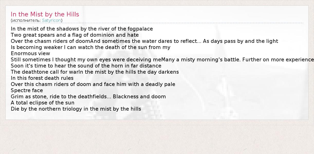 А как ты думаешь, о чем песня "In the Mist by the Hills" ?