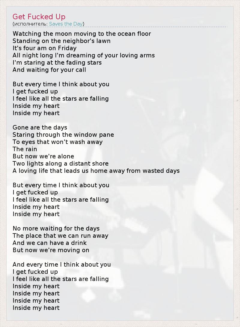 Watching the moon moving to the ocean floor Standing on the neighbor's lawn It's four am on Friday All night long I'm dreaming of your loving arms I'm staring at the fading stars And waiting for your call But every time I think about you I get fucked up I feel like all the stars are falling Inside my heart Inside my heart Gone are the days Staring through the window pane To eyes that won't wash away The rain But now we're alone Two lights along a distant shore A loving life that leads us home away from wasted days But every time I think about you I get fucked up I feel like all the stars are falling Inside my heart Inside my heart No more waiting for the days The place that we can run away And we can have a drink But now we're moving on And every time I think about you I get fucked up I feel like all the stars are falling Inside my heart Inside my heart Inside my heart Inside my heart