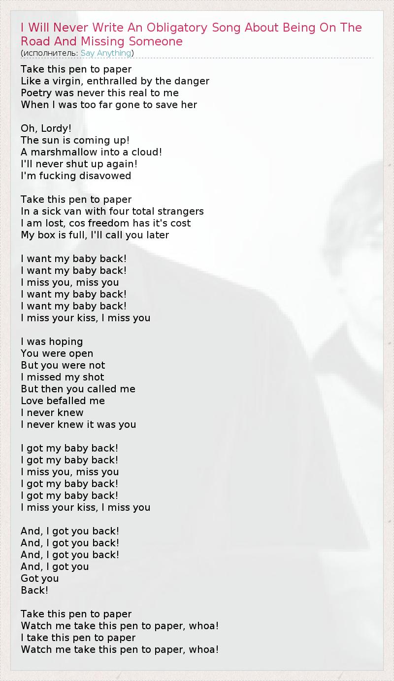 А как ты думаешь, о чем песня "I Will Never Write An Obligatory Song About Being On The Road And Missing Someone" ?