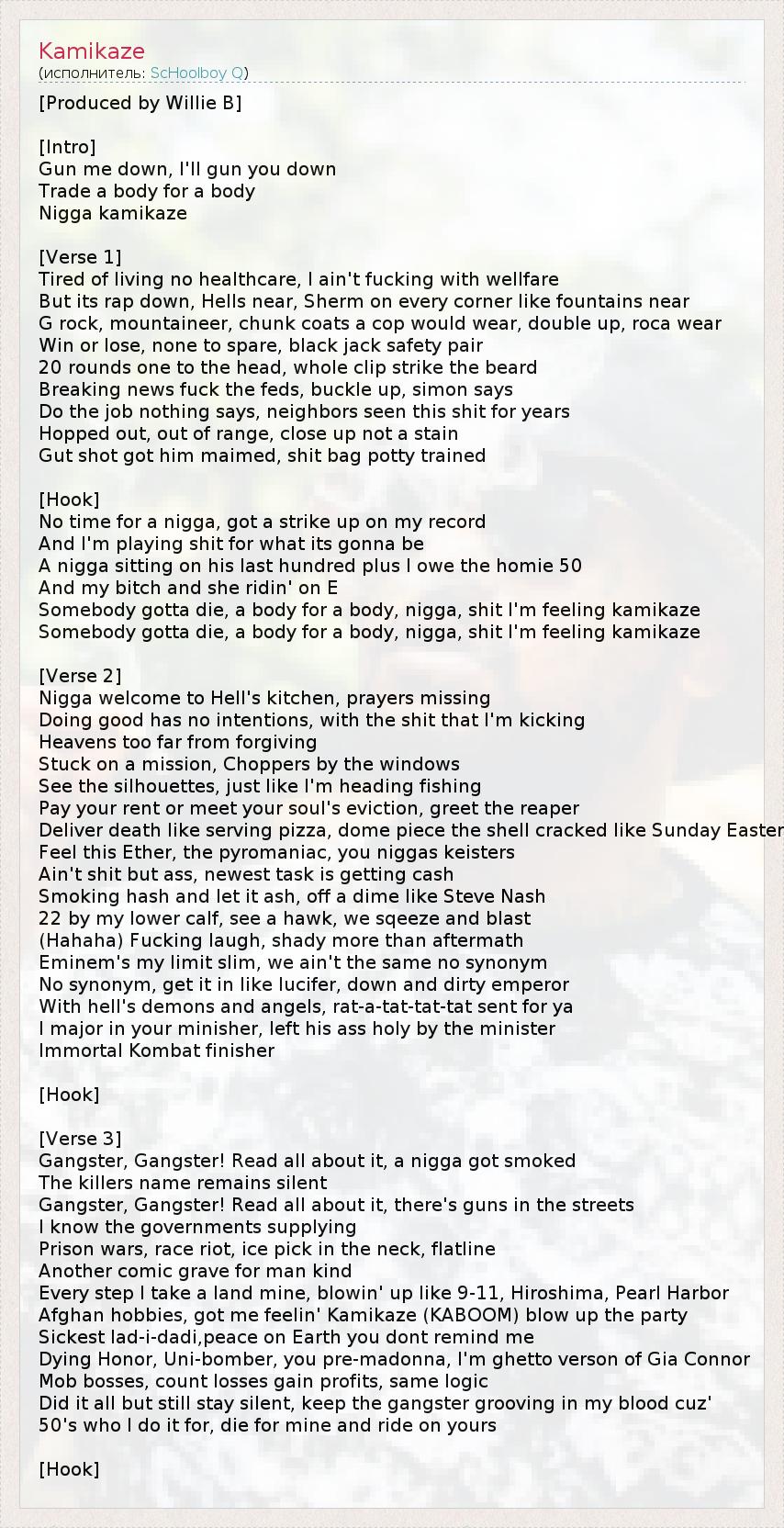 [Produced by Willie B] [Intro] Gun me down, I'll gun you down Trade a body for a body Nigga kamikaze [Verse 1] Tired of living no healthcare, I ain't fucking with wellfare But its rap down, Hells near, Sherm on every corner like fountains near G rock, mountaineer, chunk coats a cop would wear, double up, roca wear Win or lose, none to spare, black jack safety pair 20 rounds one to the head, whole clip strike the beard Breaking news fuck the feds, buckle up, simon says Do the job nothing says, neighbors seen this shit for years Hopped out, out of range, close up not a stain Gut shot got him maimed, shit bag potty trained [Hook] No time for a nigga, got a strike up on my record And I'm playing shit for what its gonna be A nigga sitting on his last hundred plus I owe the homie 50 And my bitch and she ridin' on E Somebody gotta die, a body for a body, nigga, shit I'm feeling kamikaze Somebody gotta die, a body for a body, nigga, shit I'm feeling kamikaze [Verse 2] Nigga welcome to Hell's kitchen, prayers missing Doing good has no intentions, with the shit that I'm kicking Heavens too far from forgiving Stuck on a mission, Choppers by the windows See the silhouettes, just like I'm heading fishing Pay your rent or meet your soul's eviction, greet the reaper Deliver death like serving pizza, dome piece the shell cracked like Sunday Easter Feel this Ether, the pyromaniac, you niggas keisters Ain't shit but ass, newest task is getting cash Smoking hash and let it ash, off a dime like Steve Nash 22 by my lower calf, see a hawk, we sqeeze and blast (Hahaha) Fucking laugh, shady more than aftermath Eminem's my limit slim, we ain't the same no synonym No synonym, get it in like lucifer, down and dirty emperor With hell's demons and angels, rat-a-tat-tat-tat sent for ya I major in your minisher, left his ass holy by the minister Immortal Kombat finisher [Hook] [Verse 3] Gangster, Gangster! Read all about it, a nigga got smoked The killers name remains silent Gangster, Gangster! Read all about it, there's guns in the streets I know the governments supplying Prison wars, race riot, ice pick in the neck, flatline Another comic grave for man kind Every step I take a land mine, blowin' up like 9-11, Hiroshima, Pearl Harbor Afghan hobbies, got me feelin' Kamikaze (KABOOM) blow up the party Sickest lad-i-dadi,peace on Earth you dont remind me Dying Honor, Uni-bomber, you pre-madonna, I'm ghetto verson of Gia Connor Mob bosses, count losses gain profits, same logic Did it all but still stay silent, keep the gangster grooving in my blood cuz' 50's who I do it for, die for mine and ride on yours [Hook]