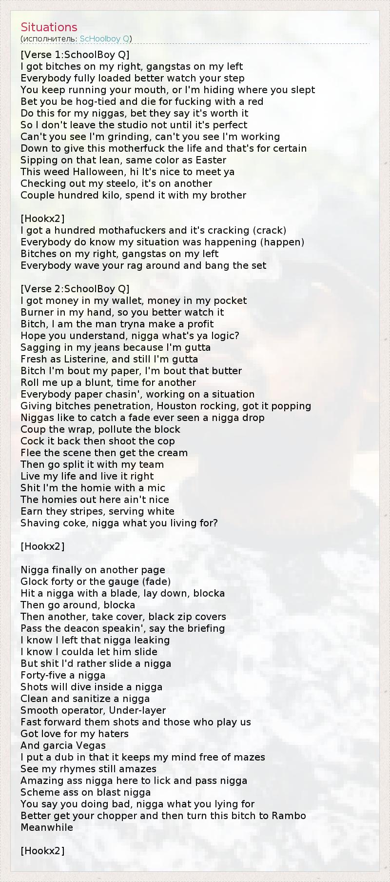 [Стих 1: Школьник Q] Я получил сук на моем правом, гангстеры, слева от меня Все полностью загружен лучше следить за своим шагом Вы продолжаете работать ваш рот, или я прячусь где вы спали Спорим, ты свинья быть связали и умереть за траха с красным Сделайте это для моих ниггеров, ставка, они говорят, что это стоит Так что я не оставил студию не, пока это не идеально Разве вы не видите, что я помола, вы не можете видеть, что я сейчас работаю Вниз, чтобы дать этой motherfuck жизнь, и это наверняка Потягивая на этом худой, того же цвета, как Пасхи Этот сорняк Хэллоуин, привет Приятно познакомиться Ya Проверка мой steelo, это по другому Пара сотен килограмм, провести его с моим братом [Hookx2] Я получил сто mothafuckers и это крекинга (трещина) Все знаю моя ситуация происходит (произошло) Суки на моем правом, гангстеры, на левой Все размахивать тряпкой и бац набор [Куплет 2: Школьник Q] Я получил деньги в моем бумажнике, деньги в кармане Горелка в моей руке, так что вам лучше смотреть Сука, я делаю человек, чтобы получить прибыль Надеюсь, ты понимаешь, что ниггер логика да? Ослабленная в моих джинсах, потому что я гуттаперчевые Свежий, как Listerine, и до сих пор я гуттаперчевые Сука я бой моей работе, я, что бой масла Раскатайте меня тупой, время для другого Все бумаги Chasin ", работая на ситуацию Предоставление суки проникновение, Хьюстон качалки, получил его появляются Ниггеры хотели поймать исчезать когда-либо видел падение ниггер Переворот обертывание, загрязняют блок Петух его тогда стрелять полицейский Бегите сцены затем получить крем Затем перейдите разделить его с моей командой Жить свою жизнь и жить правильно Дерьмо я братан с микрофоном Корешей из здесь не приятно Заработайте они полосы, выступающей белый Бритье кокс, ниггер, что вы живете в? [Hookx2] Ниггер, наконец, на другую страницу Глок сорок или датчик (Fade) Хит ниггер с лезвием, лег Blocka Тогда ходить, Blocka Потом еще укрыться, черные почтовый крышки Пропустите диакона Speakin ", говорят, что брифинг Я знаю, я оставил эту ниггер утечки Я знаю, что закреплять учебный пусть ему слайд Но дерьмо я лучше скользить ниггер Сорок пять ниггер Выстрелов окунетесь в ниггер Чистый и дезинфицировать ниггер Гладкая оператор, заместитель слой Быстрый направить их выстрелы, и те, кто играть с нами Получил любовь моих ненавистников И Гарсия-Вегас Я положил даб в том, что он держит мой ум свободным от лабиринтов См мои рифмы до сих пор поражает Удивительные задницу ниггер здесь, чтобы лизать и пройти ниггер Схема задницу на доменной ниггер Вы говорите, что делаете плохо, ниггер, что вы, лежа на Лучше получить свой вертолет, а затем включите эту суку, чтобы Rambo Тем временем [Hookx2]