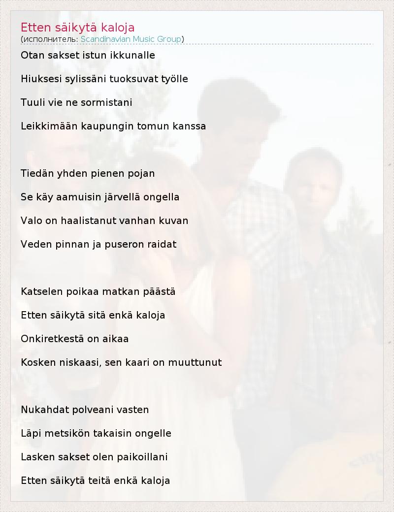 Это интересно:Scandinavian Music Group - финская группа, образованная в 2002 году. Все основатели группы ранее играли в составе популярного коллектива Ultra Bra (1994-2001).Состав:Terhi Kokkonen, vocals Joel Melasniemi, guitar Antti Lehtinen, drums Anssi Växby, bass Kyösti Salokorpi withMiikka Paatelainen, pedal steelPauliina Kokkonen, vocal harmoniesБывшие участники:Tommi Saarikivi, bass