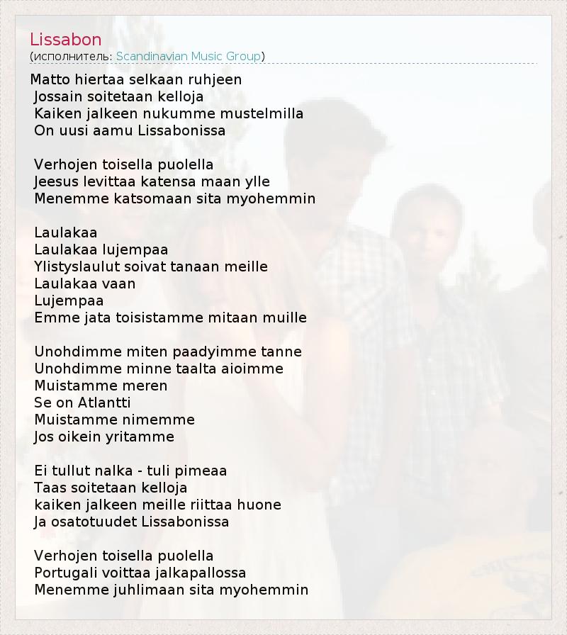 Matto hiertaa selkaan ruhjeen Jossain soitetaan kelloja Kaiken jalkeen nukumme mustelmilla On uusi aamu Lissabonissa Verhojen toisella puolella Jeesus levittaa katensa maan ylle Menemme katsomaan sita myohemmin Laulakaa Laulakaa lujempaa Ylistyslaulut soivat tanaan meille Laulakaa vaan Lujempaa Emme jata toisistamme mitaan muille Unohdimme miten paadyimme tanne Unohdimme minne taalta aioimme Muistamme meren Se on Atlantti Muistamme nimemme Jos oikein yritamme Ei tullut nalka - tuli pimeaa Taas soitetaan kelloja kaiken jalkeen meille riittaa huone Ja osatotuudet Lissabonissa Verhojen toisella puolella Portugali voittaa jalkapallossa Menemme juhlimaan sita myohemmin