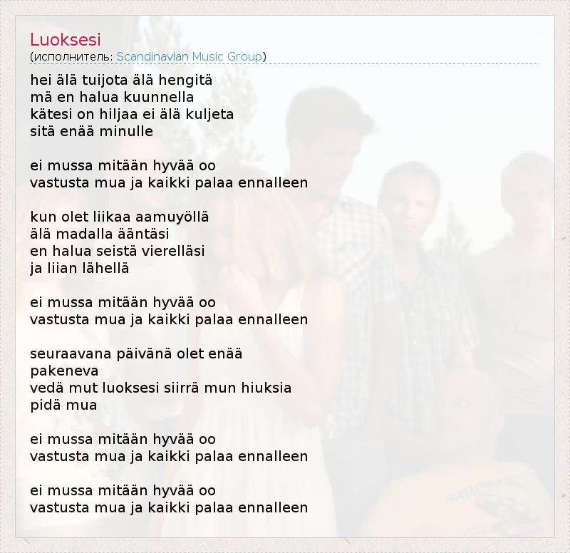 Это интересно:Scandinavian Music Group - финская группа, образованная в 2002 году. Все основатели группы ранее играли в составе популярного коллектива Ultra Bra (1994-2001).Состав:Terhi Kokkonen, vocals Joel Melasniemi, guitar Antti Lehtinen, drums Anssi Växby, bass Kyösti Salokorpi withMiikka Paatelainen, pedal steelPauliina Kokkonen, vocal harmoniesБывшие участники:Tommi Saarikivi, bass