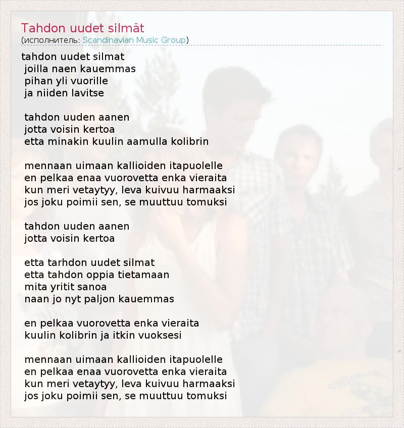 А как ты думаешь, о чем песня "Tahdon uudet silmät" ?